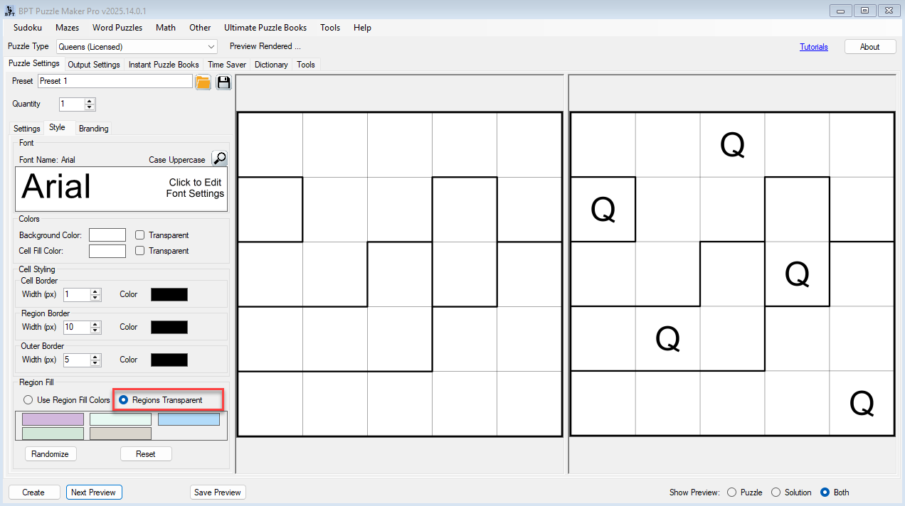 Generate professional Queens puzzles with randomized regions, custom symbols, and publication-ready outputs. Create unique puzzle books in minutes, not hours.