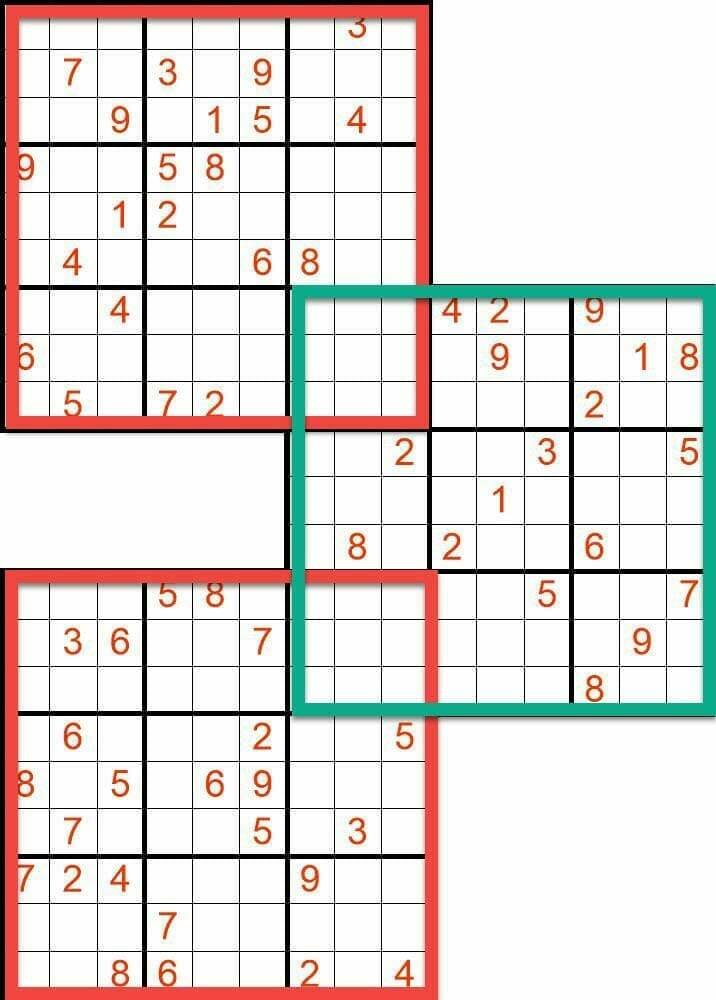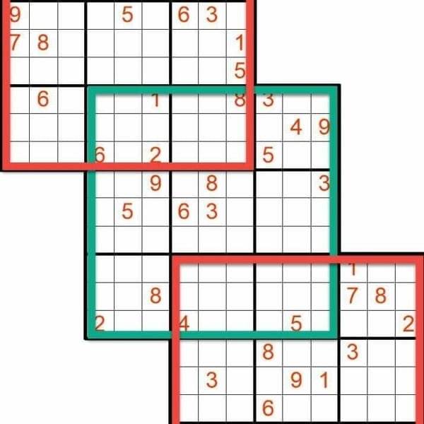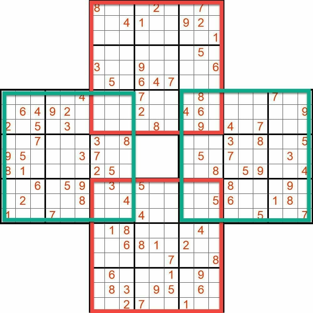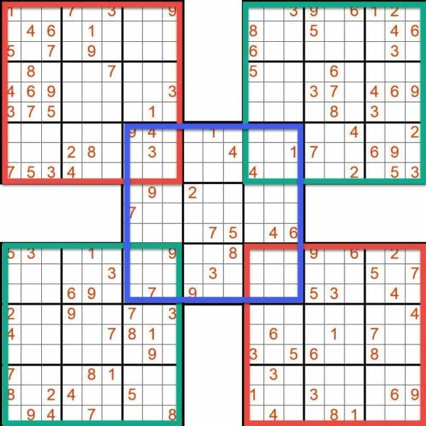 Sudoku SamuraiCreate Sudoku Samurai – Five overlappign sudoku grids |