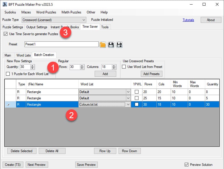 Time for batch creation! This is the fun part of the time saver. You’ve done your prep work, now you can select how many puzzles you want, what the sizes of the puzzles are, you can load in presets, et cetera.