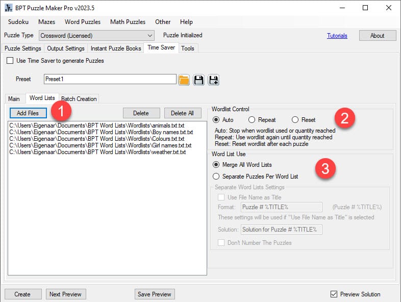 You can set if the word lists can be merged or not (3). If you have themed word lists and want to create themed puzzles, you probably don’t want to mix them. However, if the puzzles do not have a theme, merging them can create more unique puzzles, which is good too.