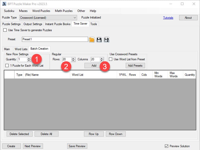 Time for batch creation! This is the fun part of the time saver. You’ve done your prep work, now you can select how many puzzles you want, what the sizes of the puzzles are, you can load in presets, et cetera.