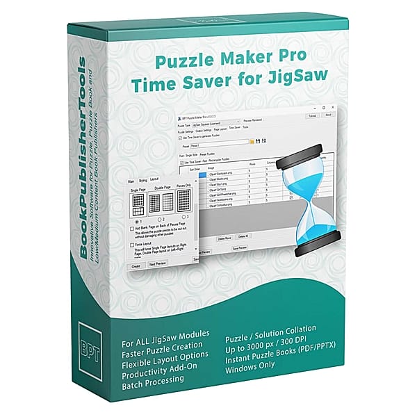 Custom Output LocationSet up your own output folder structure, including date and custom name placeholders | Instant Puzzle BooksUse the Puzzle Maker Pro options to generate Instant Puzzle Books in Powerpoint or PDF format | Puzzle NumberingUse custom puzzle numbering, to create parts of puzzle books that can be appended later | Trim SizeSet up your own trim size, from 1×1 to 15×15 inch |