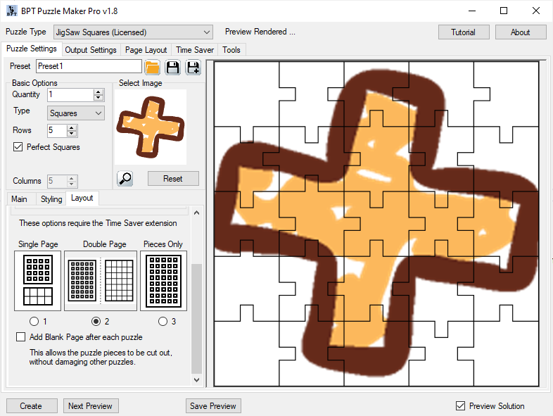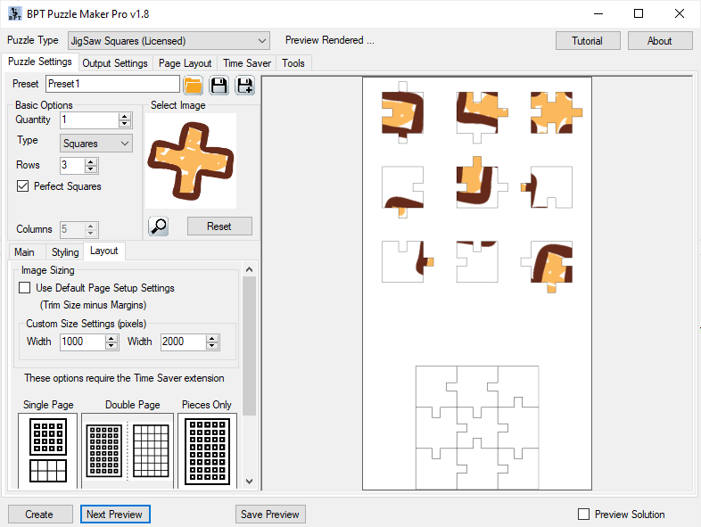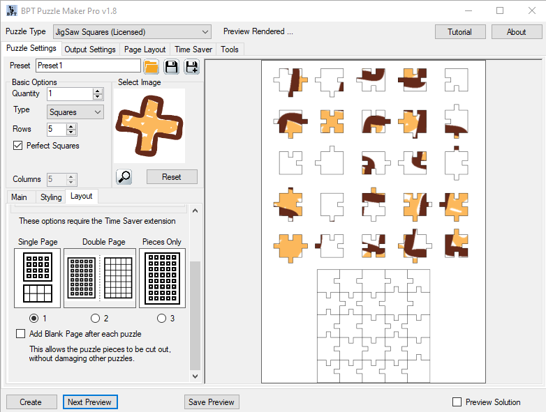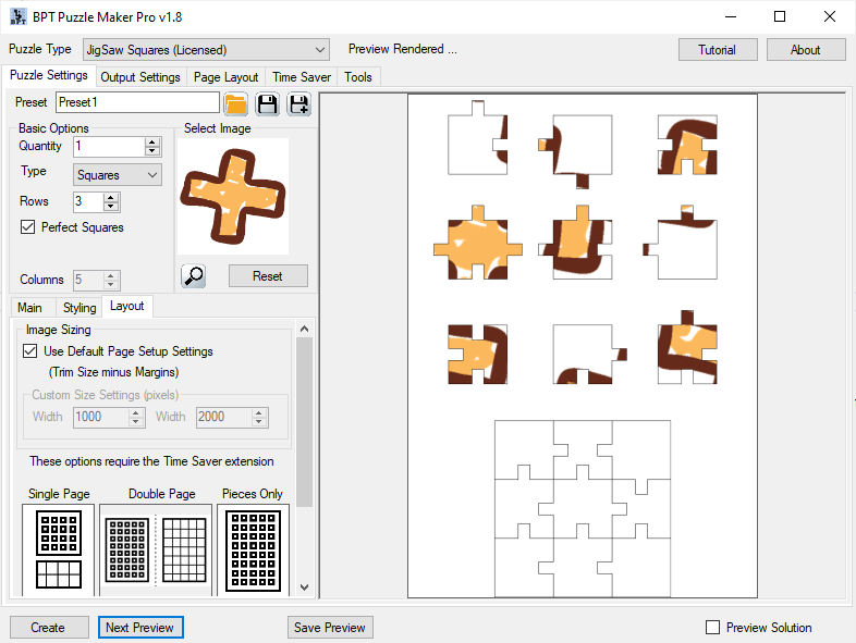 Puzzle Maker Pro – JigSaw supports three page layouts. These are selected in the “Puzzle Settings” tab, not in the global “Page Layout” tab.
