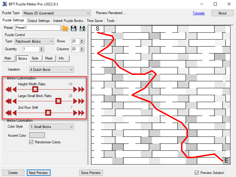 Select Mazes 2D in the main Puzzle Type dropdown menu, then select Patchwork Bricks in the (maze) Type dropdown menu. Click “Next Preview” to quickly get a first impression. (Changing settings does not automatically create a new preview, because you may want to change multiple settings, and the mazes, especially at larger sizes, may take some time to generate).