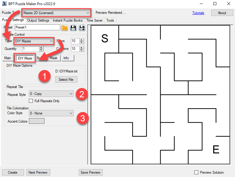 Select Mazes 2D in the main Puzzle Type dropdown menu, then select DIY Mazes in the (maze) Type dropdown menu. Click “Next Preview” to quickly get a first impression. (Changing settings does not automatically create a new preview, because you may want to change multiple settings, and the mazes, especially at larger sizes, may take some time to generate).