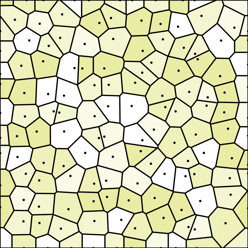 In this example image, the dots are placed randomly. The black lines (cell borders) are equally distant from the two points they separate. Voronoi on Wikipedia.