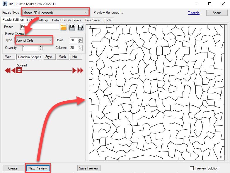 Select Mazes 2D in the main Puzzle Type dropdown menu, then select either “Voronoi Cells” or “Triangulation” in the (maze) Type dropdown menu. Click “Next Preview” to quickly get a first impression. (Changing settings does not automatically create a new preview, because you may want to change multiple settings, and the mazes, especially at larger sizes, may take some time to generate).