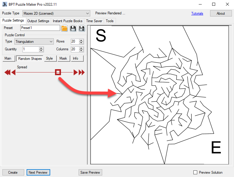 The “Spread” slider will force the points to be more close to the center (while still random). This results in a maze with a very different look and feel.