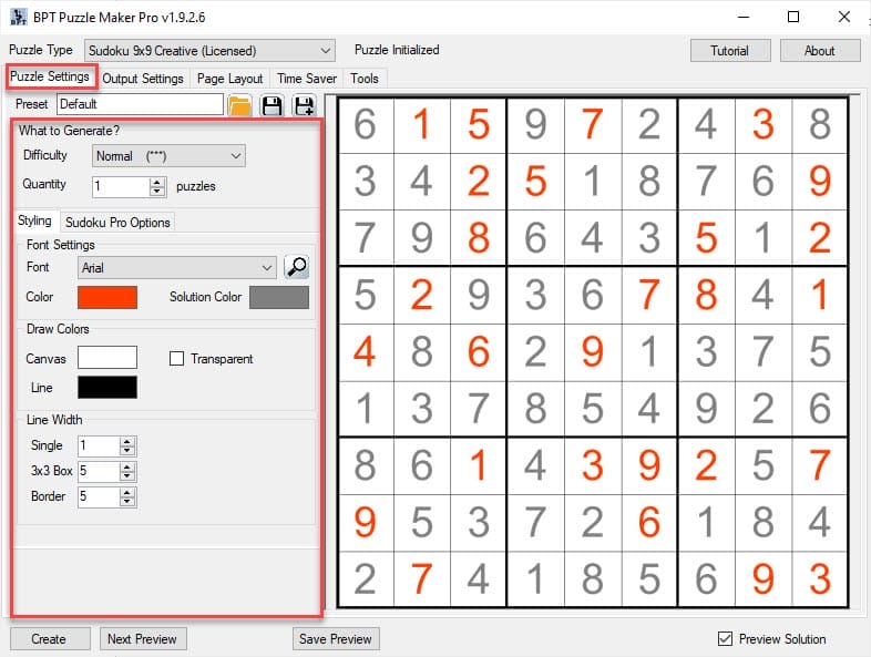 The first step is to set the puzzle settings you want. The screenshot shows sudoku as an example. You can set the difficulty level and quantity (the number of puzzles). After that you can set the styling and the advanced options. Use preview to verify that it’s to your liking.