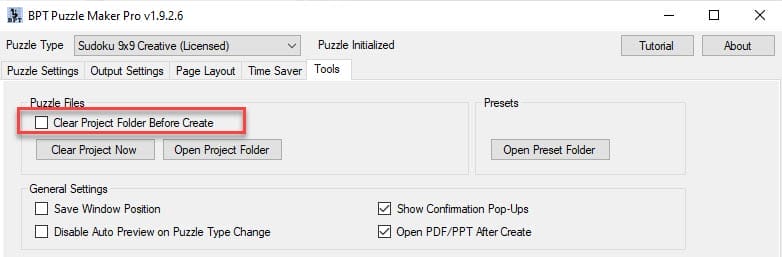 So: Switch off the option “Clear Project Folder Before Create”, and switch on the option “Skip Puzzle Creation”.