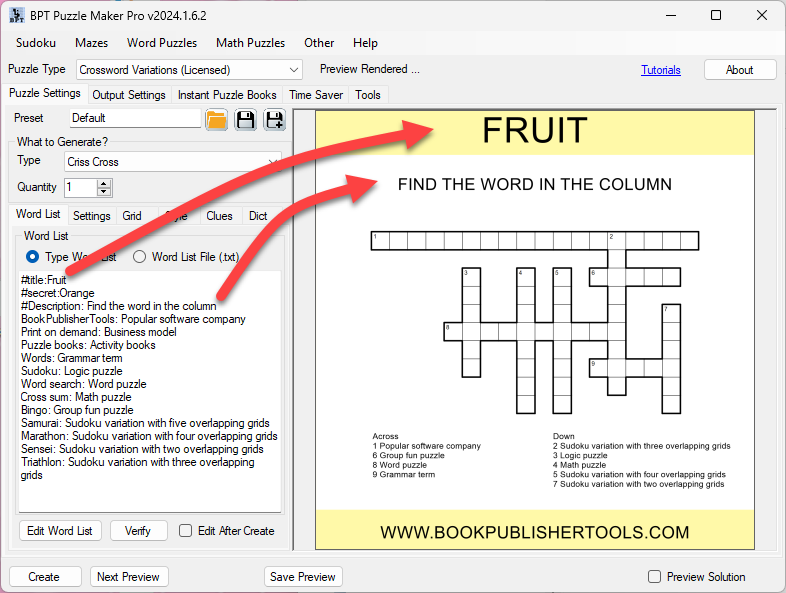 For some modules, e.g. Crossword Variations, it’s now possible to create image output with a title and a watermark, in addition to the regular output for puzzle books. Please be aware, this is not yet available for all puzzle modules.