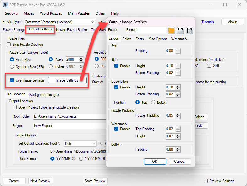 When a puzzle in Puzzle Maker Pro supports these new Image Settings, there is an option on the Output Settings tab to edit the settings: