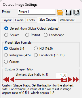By default the image settings from the “Output Settings” tab in Puzzle Maker Pro are used. You can override this by selecting one of the size settings on the “Size Options” tab. This allows you to configure specific size settings for your social media platform.