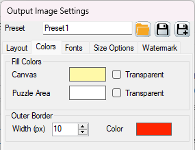 You can set background color for the entire image (the canvas color) and the background color for the puzzle. (If the puzzle module has it’s own canvas color settings, these will be used as well). Additionally you can add an outer border to the image.