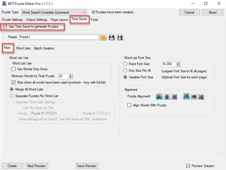 To use the Time Saver for Word Search, first select Word Search in the Puzzle Type menu. Then go to the Time Saver tab, and check the “Use Time Saver to generate Puzzles” option. You can see three tab areas in this window: Main, Word Lists, and Batch Creation.