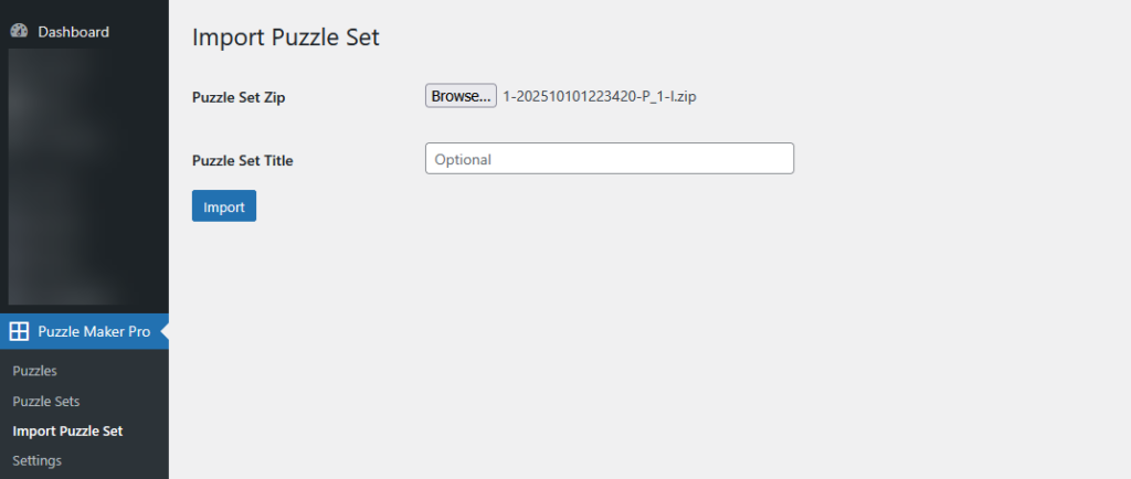 - In your WordPress dashboard, open Puzzle Sets → Import Puzzle Set.