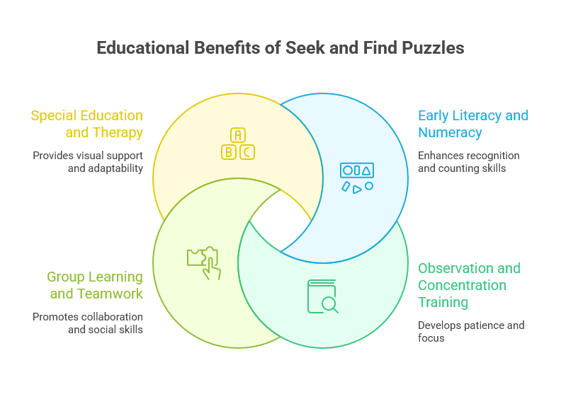 Teachers can use letter- and number-based Seek and Find puzzles to reinforce recognition and counting. Searching for specific symbols helps children associate abstract ideas (letters, numbers) with visual patterns.