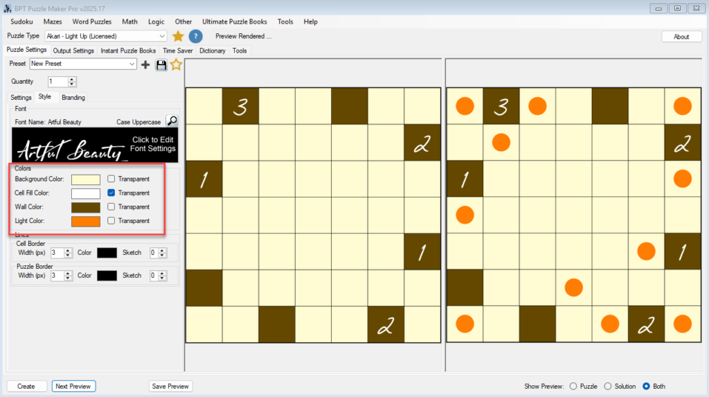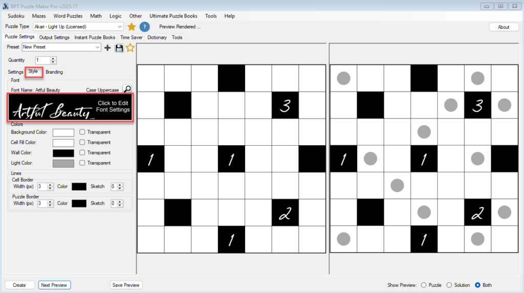 This tutorial explains how to style Akari puzzles to match your preferred look and publication format using the Style and Branding tabs.