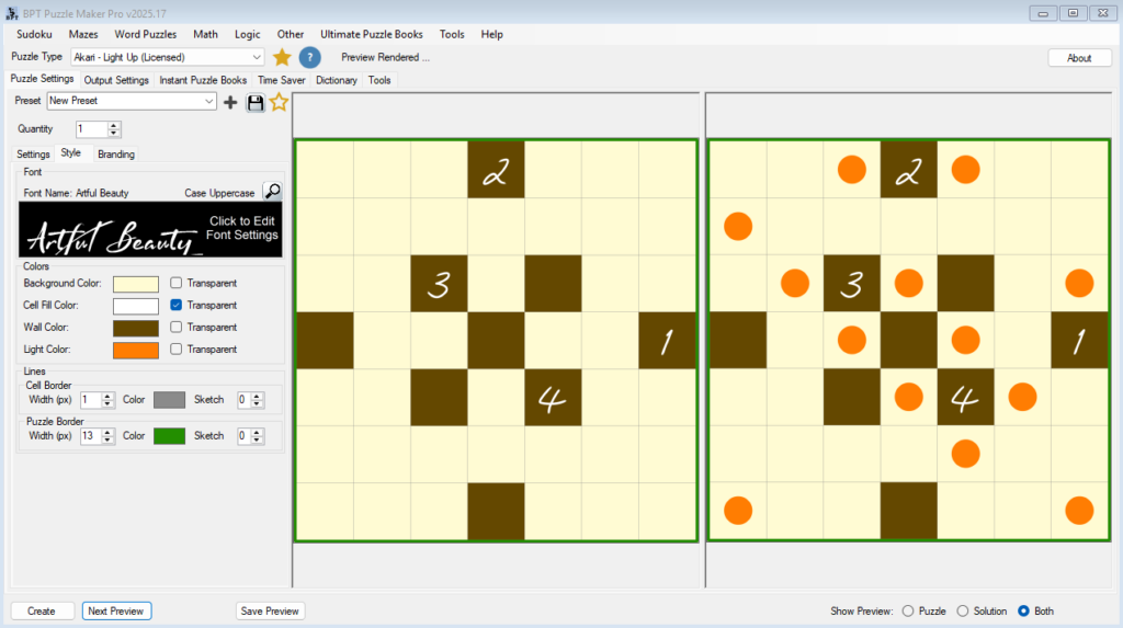 Styling presets can be reused across puzzles, ensuring consistent layouts for entire books or themed puzzle sets.