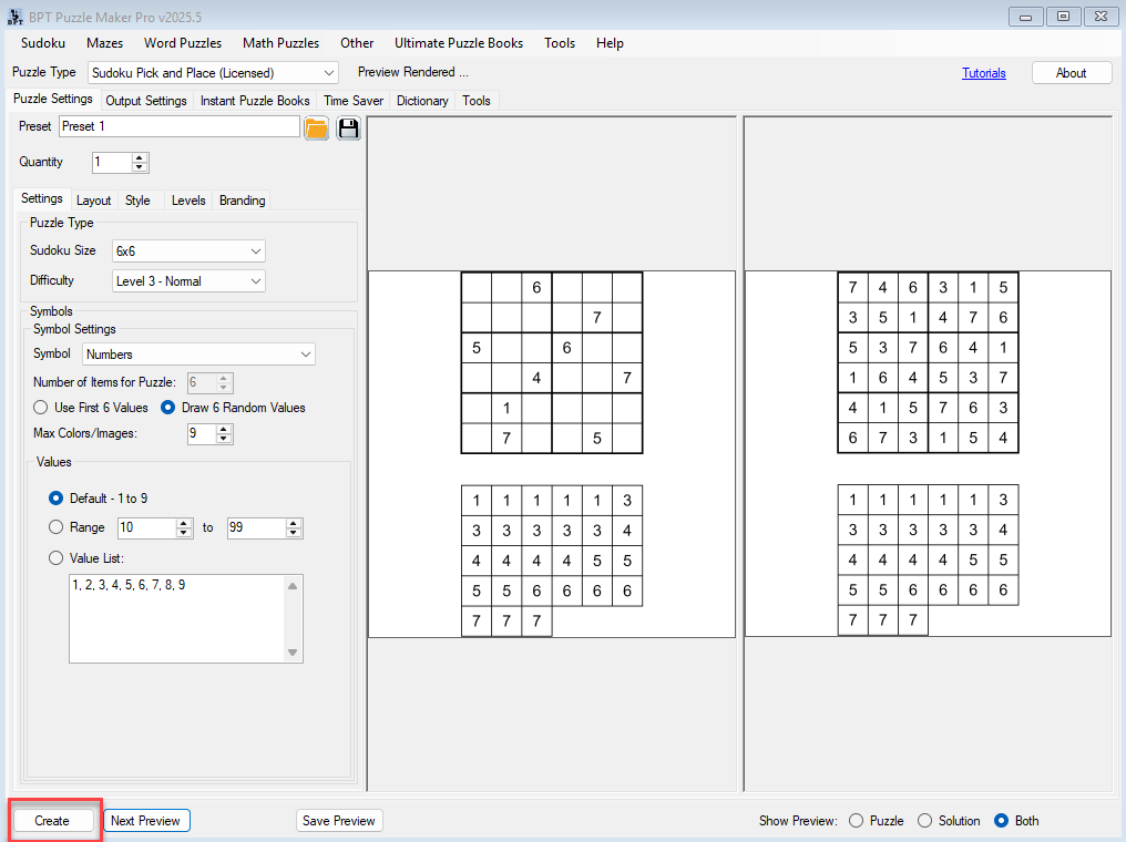 - Or click Create to generate and save multiple puzzles using current settings.
