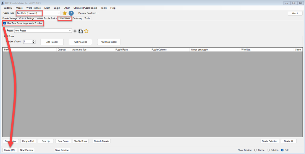 Time Saver and Production Workflows (Business Edition) Overview This tutorial explains how to use Time Saver to manage production workflows for Box Code puzzles. Time Saver does not replace standard puzzle generation.Instead, it lets you combine multiple generation configurations into a single, structured run using a row-based table. This is especially useful when working with: