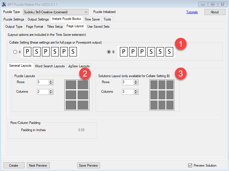 - Set the number of Rows and Columns for your puzzles page. If you use Collate setting A, this layout will also be used for the solutions