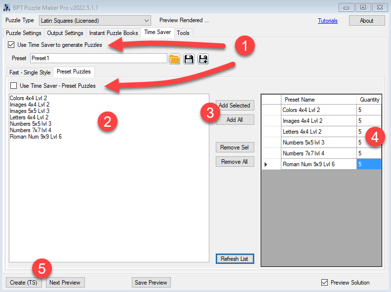 - Make sure “Use Time Saver to generate Puzzles” is checked (1). You’ll see the text on the Create button change from “Create” to “Create (TS)” (5), where TS stands for Time Saver.