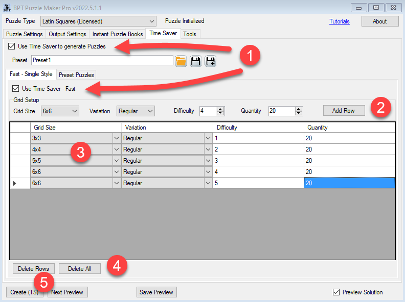 Additionally, click the “Use Time Saver – Fast” option. (You can optionally use both the Fast and the Presets options at the same time). - Choose a Grid Size, Difficulty level and Quantity, and click “Add Row” (2). This will add a row to the table. You can edit the settings for each row afterwards. (Note: The “Variation” option is not used yet)