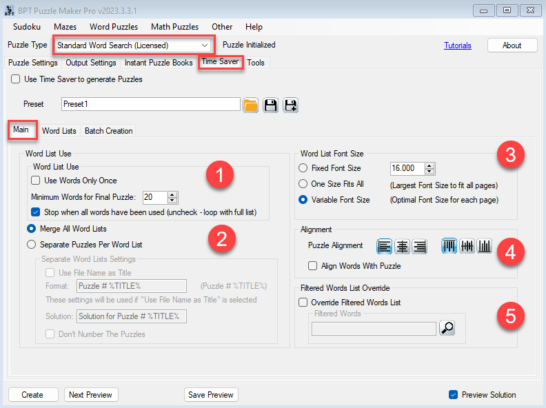 With Puzzle Maker Pro version v2023.3.3, the Time Saver for Word Search has undergone significant changes. It now lets you combine multiple puzzle types in one single table (more about that later). This allows you to completely set up your puzzle book to look the way you want.