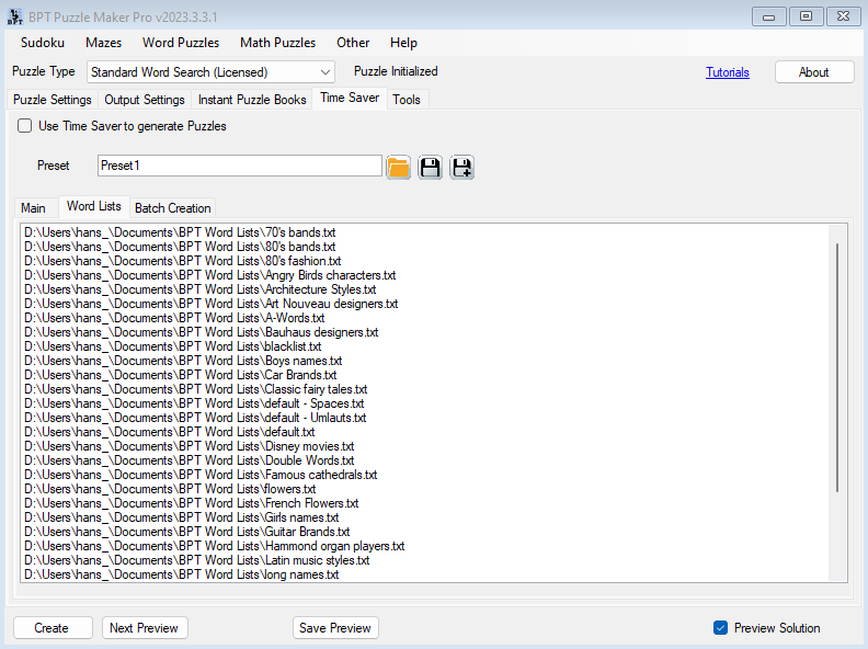 - Select the Word Lists you want to use in your puzzle book,