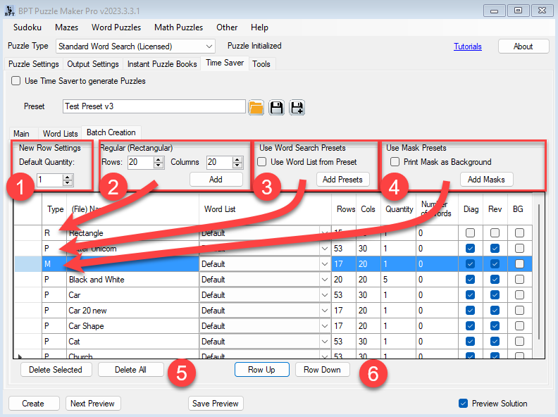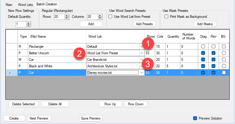 What you see here is a table that contains a row for each puzzle configuration that you want to create. Regular puzzles with just the number of rows and columns, Preset puzzles from your own Word Search presets, and Mask puzzles, from your own saved masks.