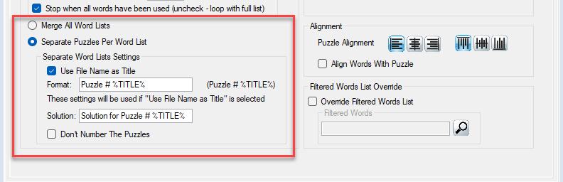 The “Word List Use” options will override the similar options for the Word Search Puzzle Settings tab.