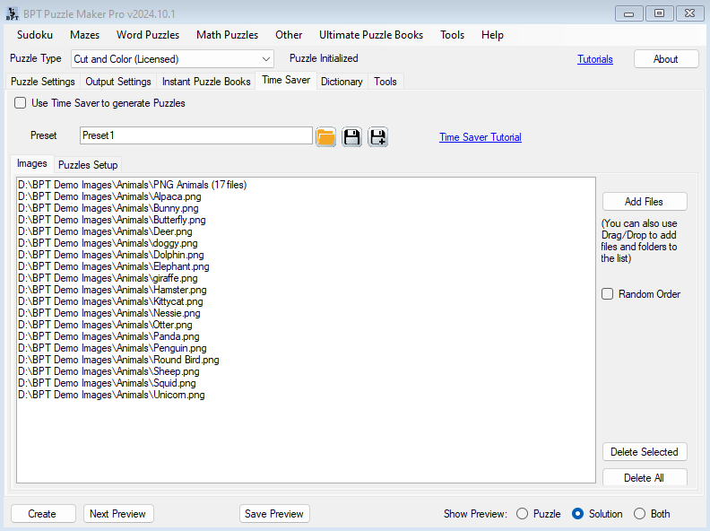 With the Time Saver for Kids Color Puzzles you can set up a list of images to use, and then set up a list of puzzle formats to generate. Settings that are not configured in the Time Saver, will be ‘inherited’ from the current puzzle setup.