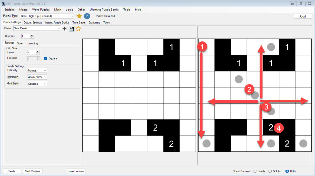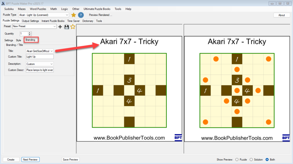 Purpose This tutorial explains how to style Akari puzzles to match your preferred look and publication format using the Style and Branding tabs. Audience Puzzle book creators, designers, and educators who want professional-looking puzzles for print, ebooks, or online use. Step 1 – Open the Style Tab Step 2 – Choose Colors You can control […]