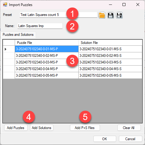 If the puzzles and solutions are in a single folder and grouped together (e.g. puzzle 1, solution 1, puzzle 2, solution 2, etc), use the “Add P+S Files” button (5). This will expect the selected file list to be alternating puzzle and solution files, and fill the table accordingly.