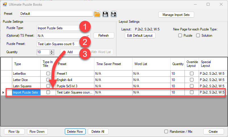 In the main Ultimate Puzzle Books window, use the Puzzle Type “Import Puzzle Sets”, select the preset you just created and click “Add”. When creating the puzzle book, this set will be used along with all the puzzles that are generated with Puzzle Maker Pro.