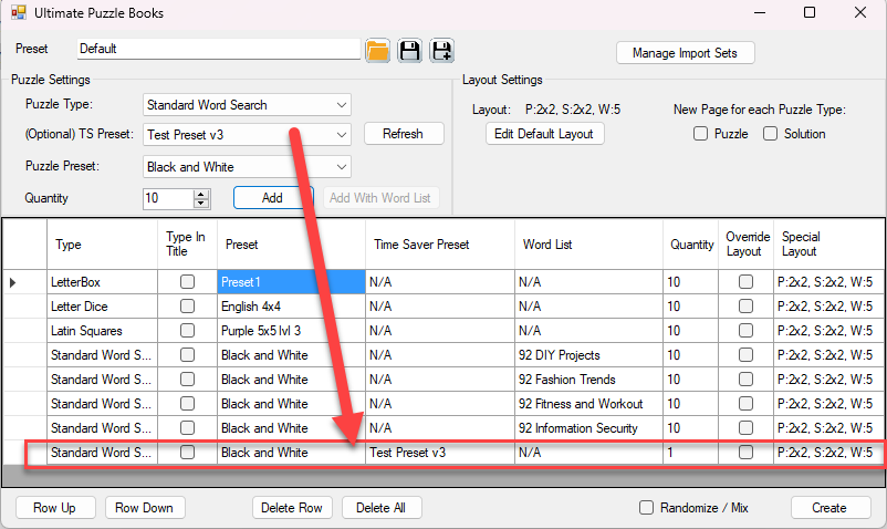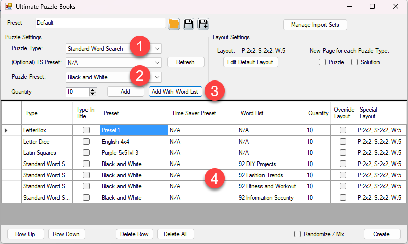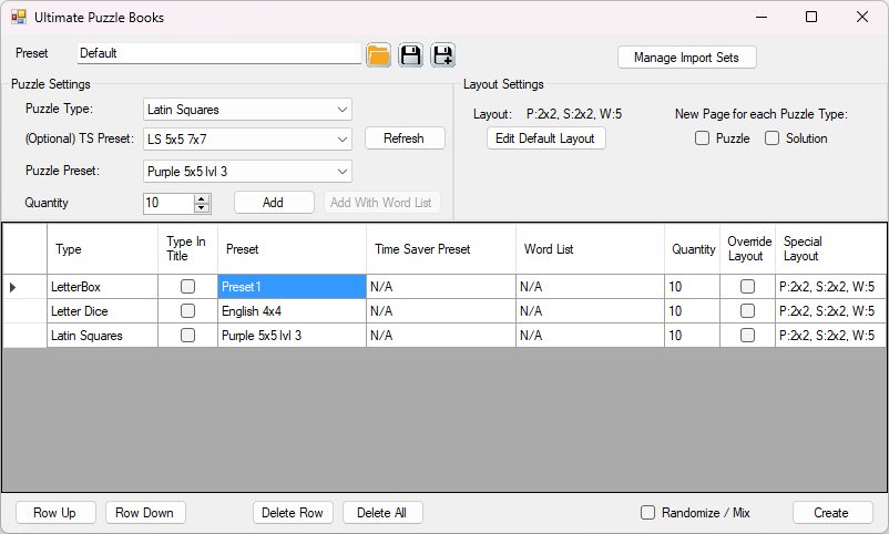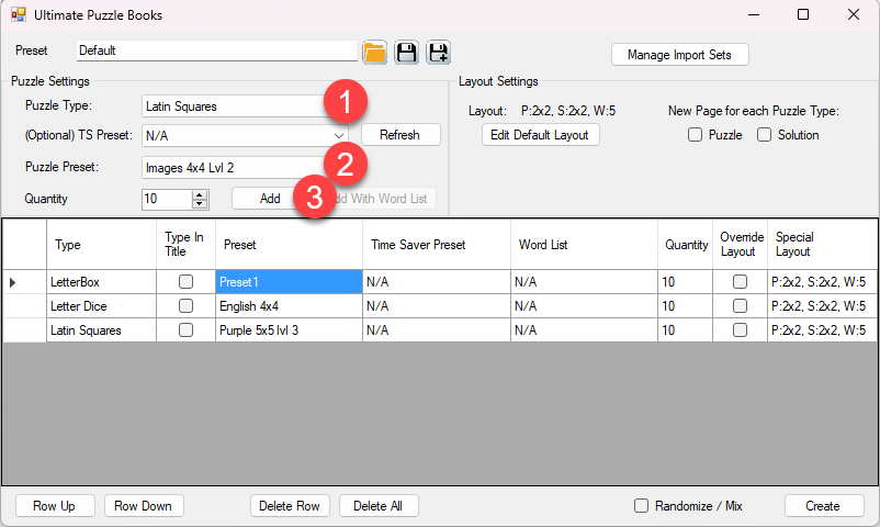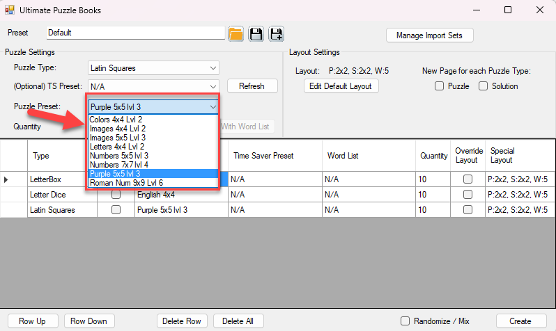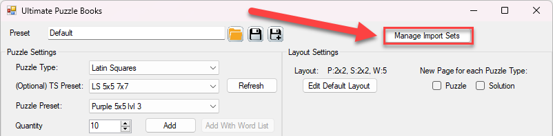 In the main Ultimate Puzzle Books window, use the Puzzle Type “Import Puzzle Sets”, select the preset you just created and click “Add”. When creating the puzzle book, this set will be used along with all the puzzles that are generated with Puzzle Maker Pro.