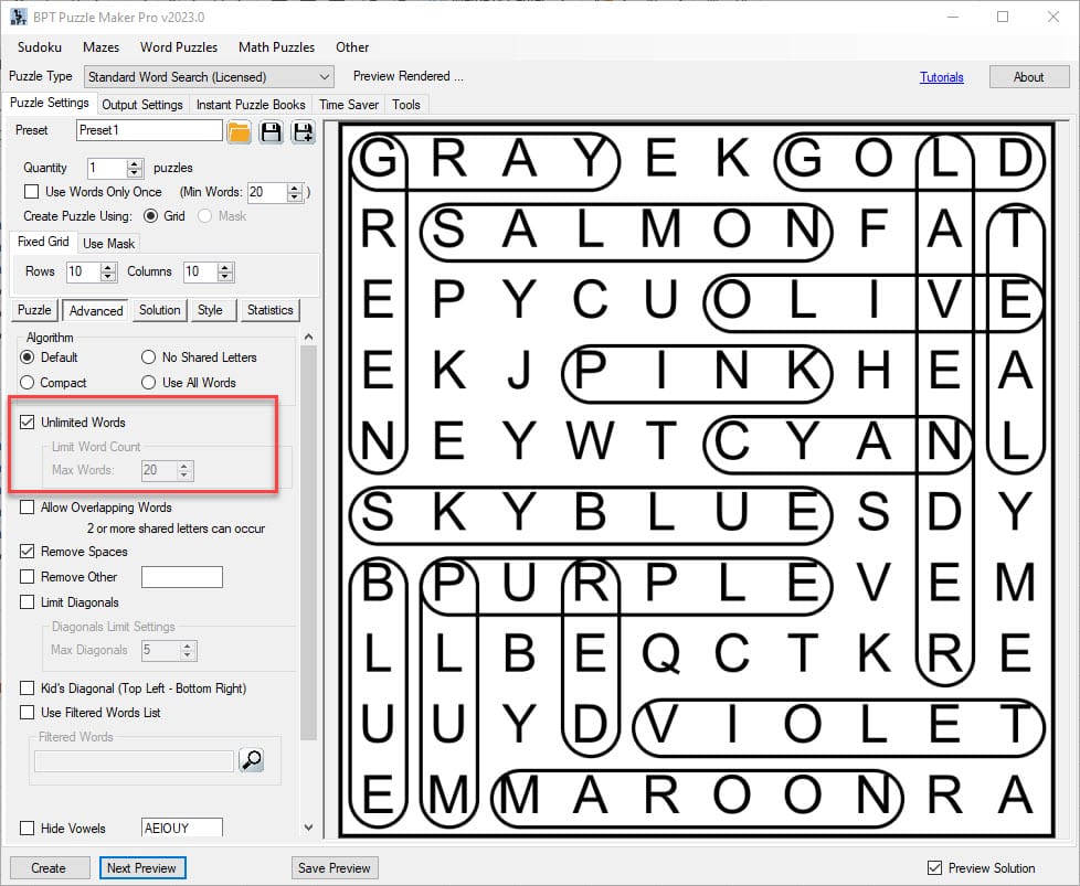 Puzzle Maker Pro – Word Search will allow you to set the number of words to unlimited (so, as many as possible), or to a certain limit.