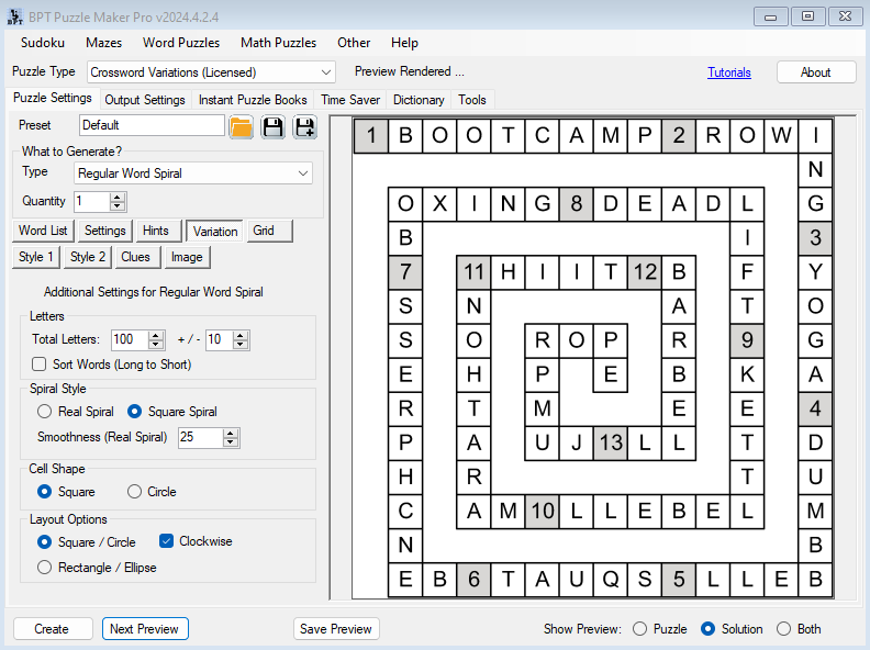 Both Word Spiral and Secret Word Spiral offer you a couple of different shape variations of the spiral (also called word snake in some magazines). Because the number of letters is important for the spiral, for these puzzles you set the approximate number of letters, instead of the number of words. (The minimum number of words setting will not be used).