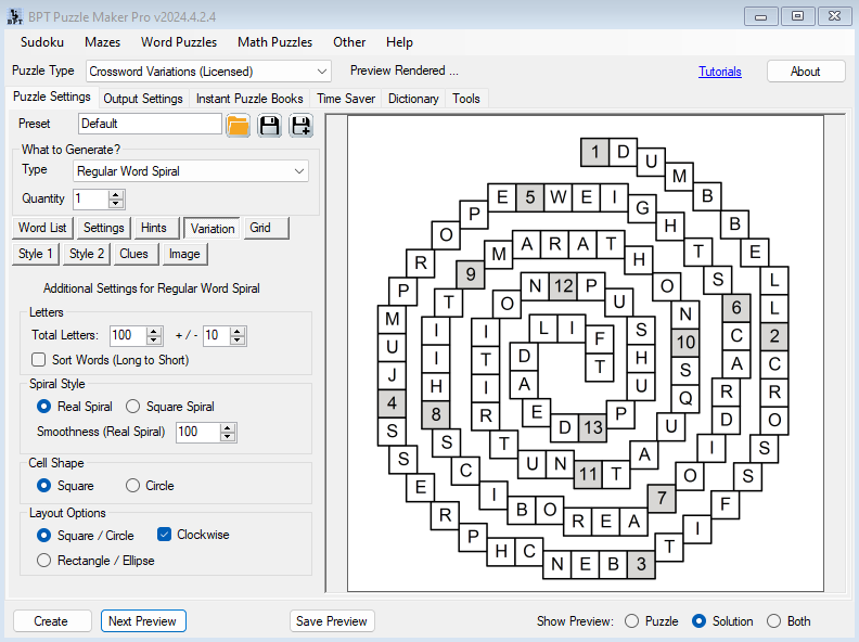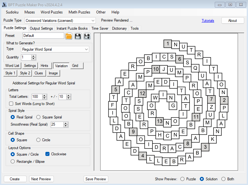 Both Word Spiral and Secret Word Spiral offer you a couple of different shape variations of the spiral (also called word snake in some magazines). Because the number of letters is important for the spiral, for these puzzles you set the approximate number of letters, instead of the number of words. (The minimum number of words setting will not be used).