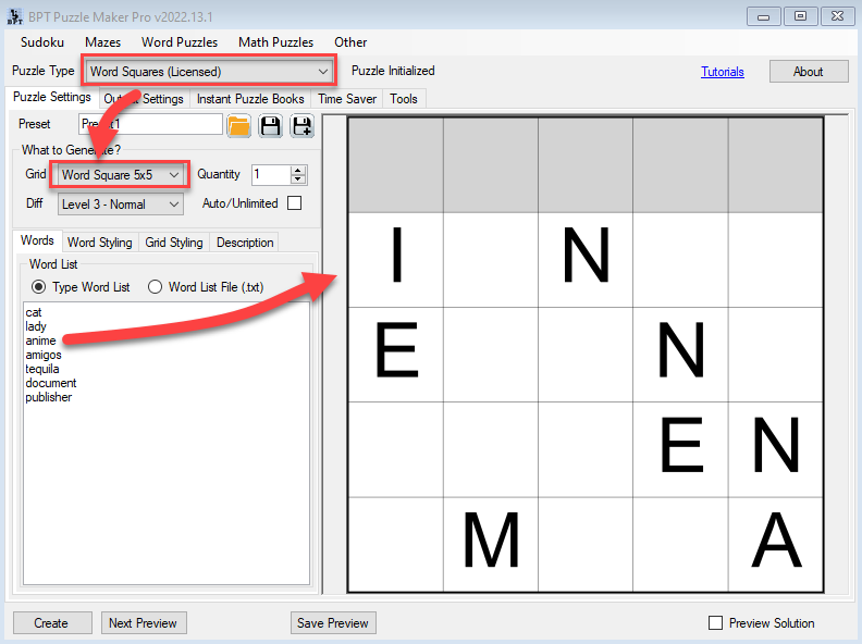 To create puzzles, you’ll need to add a word list (as shown in the screenshot), and click Next Preview to generate a puzzle. Each click will result in a different puzzle.