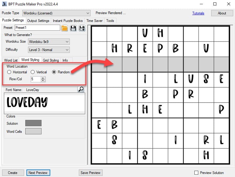 You can choose whether the word should be placed Horizontally, Vertically or Randomly. You can also specify the exact position – which row or column to use. For “Random”, there’s a 50/50 chance of the word being placed horizontally or vertically, and the position (row/column) is also determined randomly.